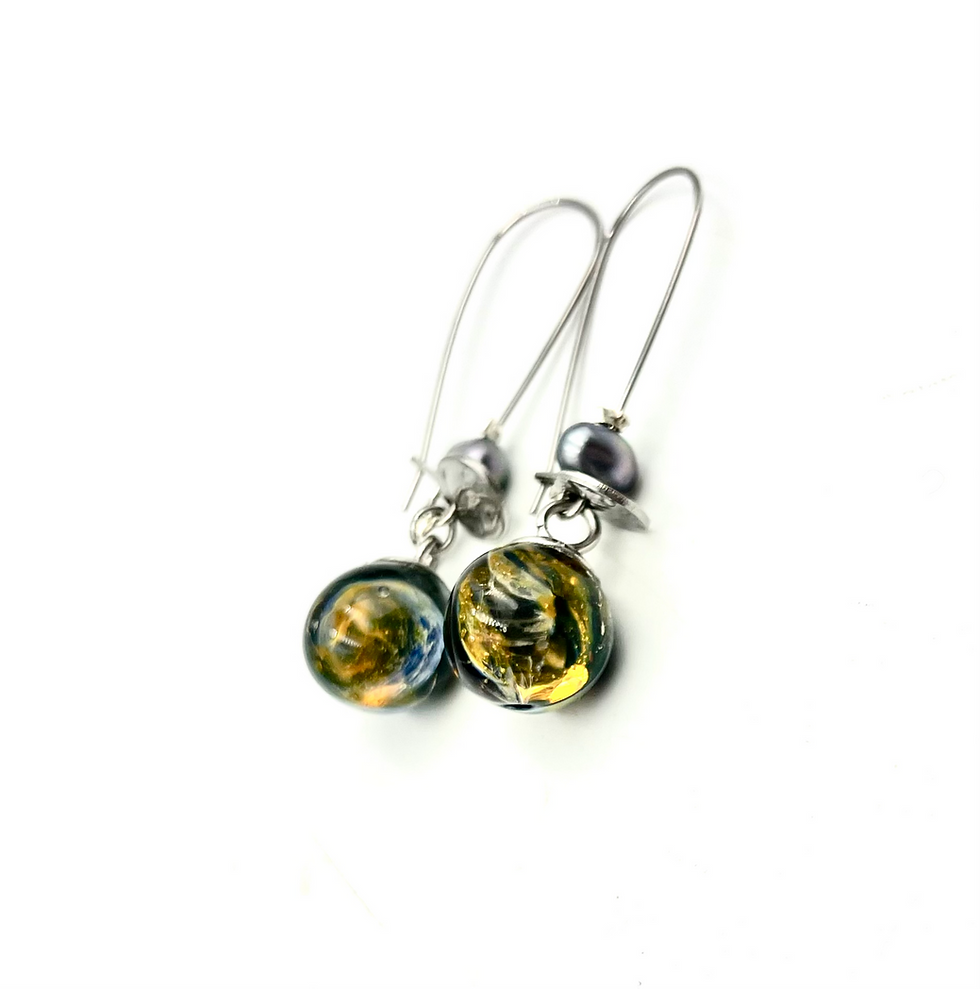 Épurées, lumineuses et graphiques, les boucles Circum jouent sur la géométrie du cercle et la profondeur d’un cabochon de verre fusionné. Une goutte de vert intense semble flotter dans l’anneau, comme un minéral capturé au cœur d’un halo doré.